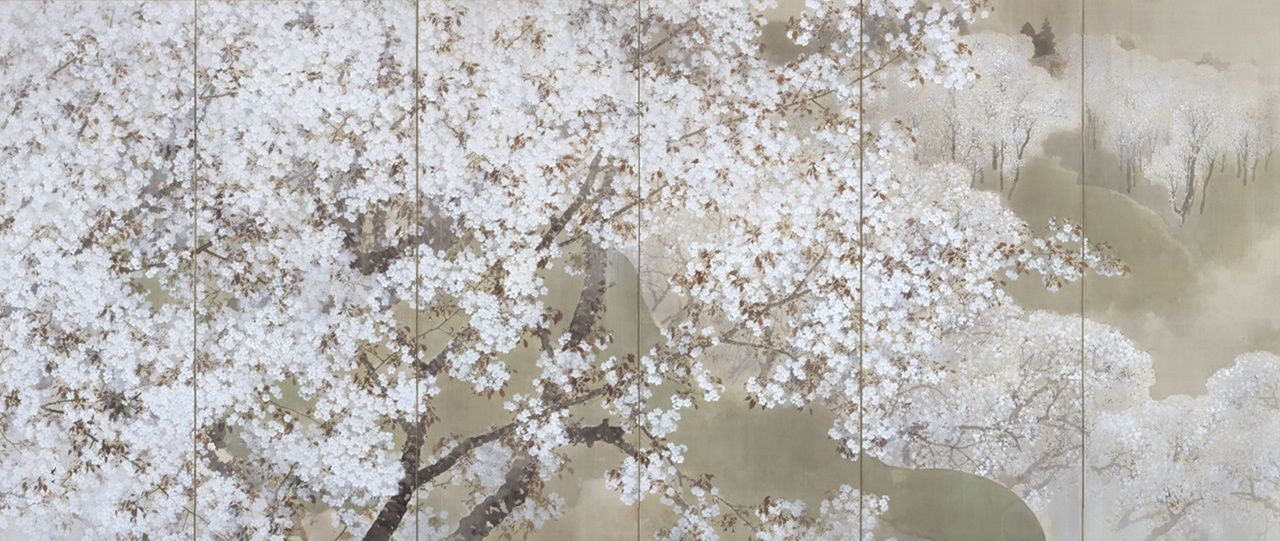 国の重要文化財に指定されている川合玉堂の『行く春』で例えると、1番右の1扇では桜の花びらがまばらだが、左に進むに従って枚数が増え、左隻の最後に満開の桜が現れる。「こうしてみると絵の中に時間を感じることができます」(鶴見さん)。まるで桜の下をくぐり抜けていくような感覚だ。