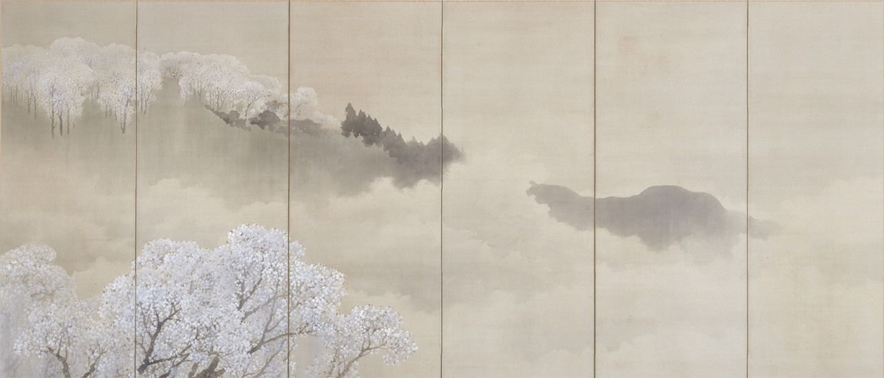 菊池芳文『小雨ふる吉野』(1914年、六曲一双屏風、 左隻縦153.7センチ、横357.0)