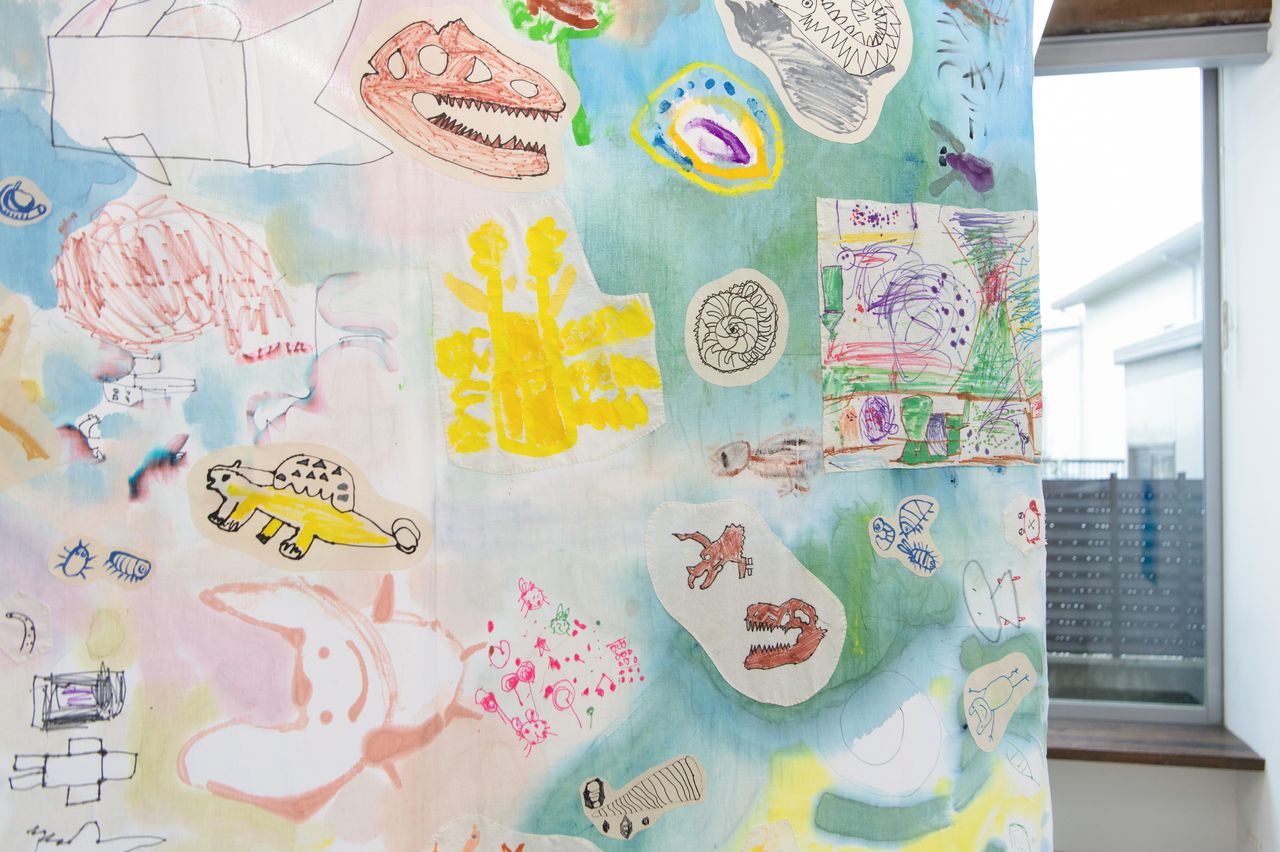 美術館に入るとまず目に飛び込んで来るのが、天井からつり下げたタペストリー風の作品。3回目のワークショップで子どもたちが描いた絵を、美術館のスタッフとさくら学級の先生らが、大きな布にパッチワークのように縫いつけた力作だ。