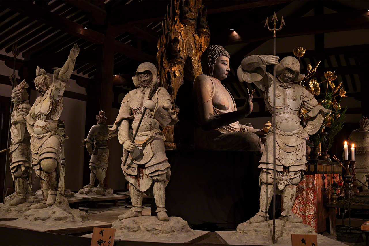 十二神将に囲まれた円陣の中央で圧倒的なオーラを放つ、新薬師寺の本尊・薬師如来だ。新薬師寺は光明皇后が聖武天皇の病気平癒のために747(天平19)年に建立した寺院で、同像は8世紀末、平安初期に制作された。
