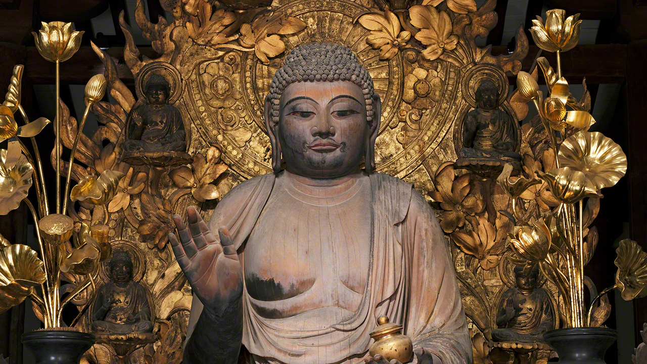 左手に薬壺(やっこ)を持ち、右手は衆生の畏(おそ)れる心を取り除く「施無畏印(せむいいん)」を結ぶ。ゆったりとくつろいだ雰囲気で、癒やしの仏らしい包容力を感じさせる。