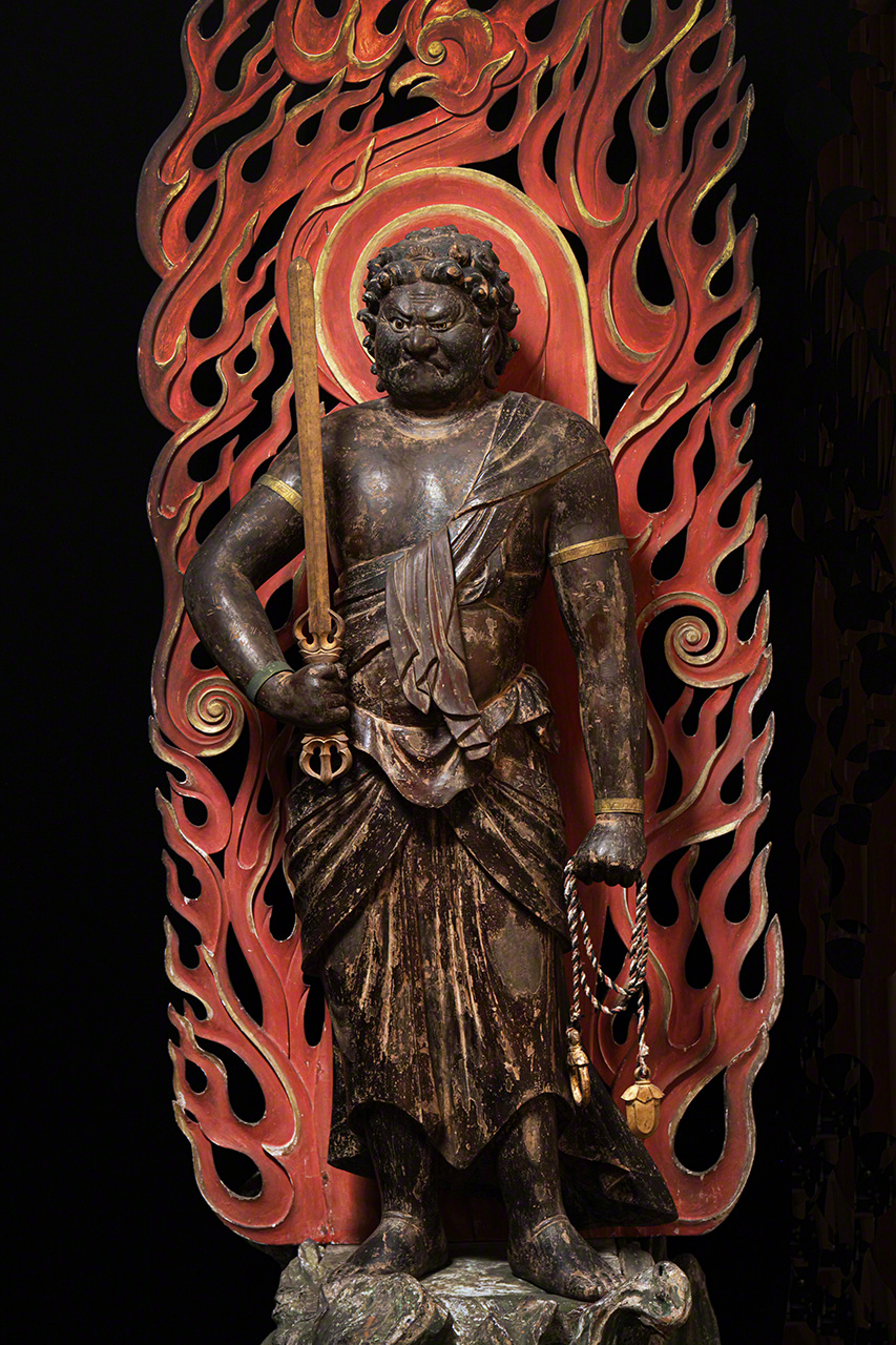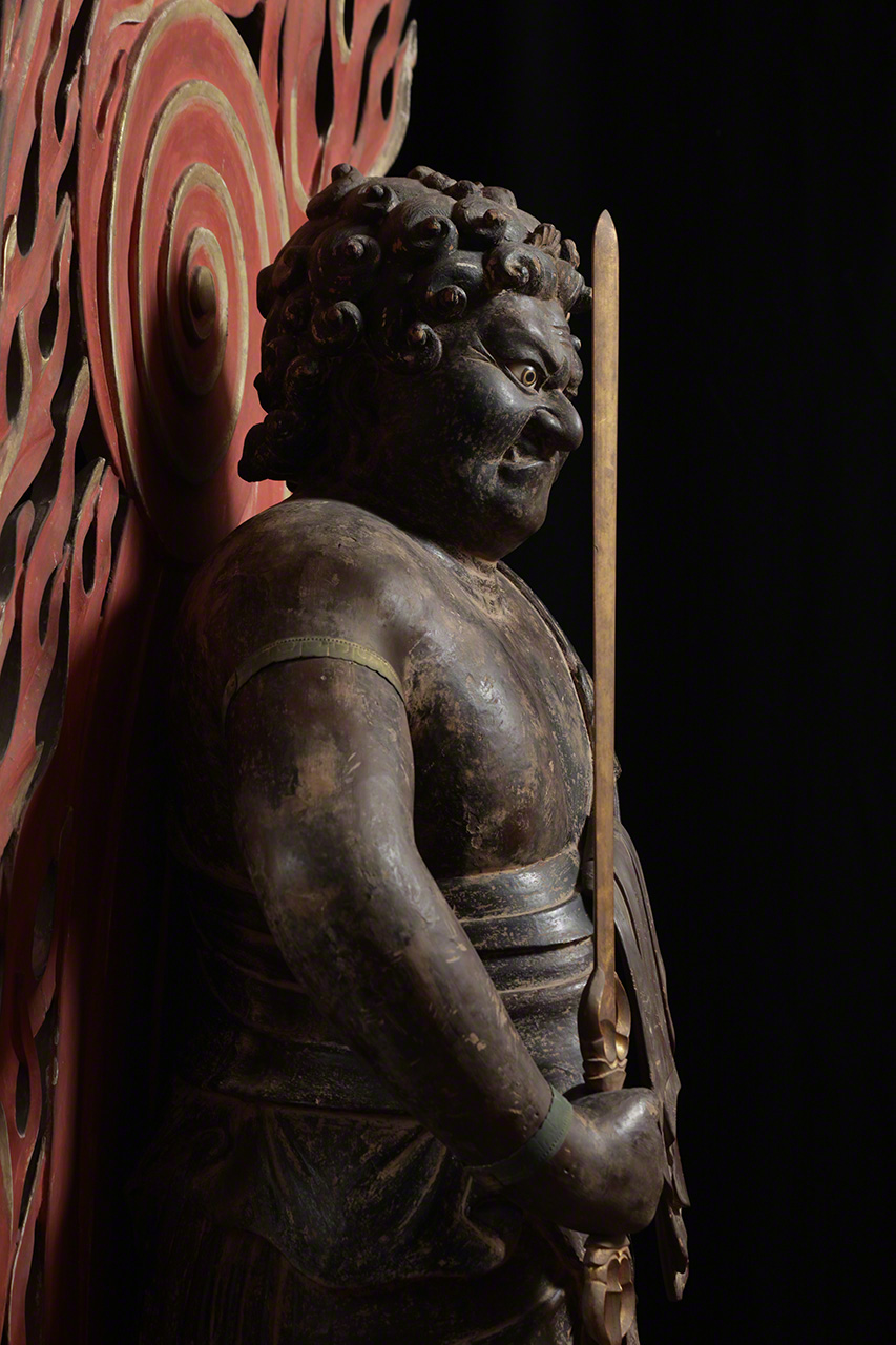 剣を構える右腕と、羂索(けんさく=鳥獣を捕獲するための綱)を下げる左手、全身にみなぎる圧倒的な迫力。この一瞬の動きを切り取ったかのような躍動感ある表現に、天才仏師の才能を感じる。ヒノキの寄せ木造で、目には水晶を使った玉眼をはめ込んでいる。