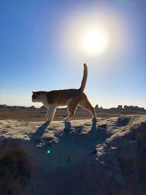 ウズベキスタンの西部砂漠地帯にある古代都市遺跡アヤズ・カラで暮らす猫(2018年11月9日、評者撮影)