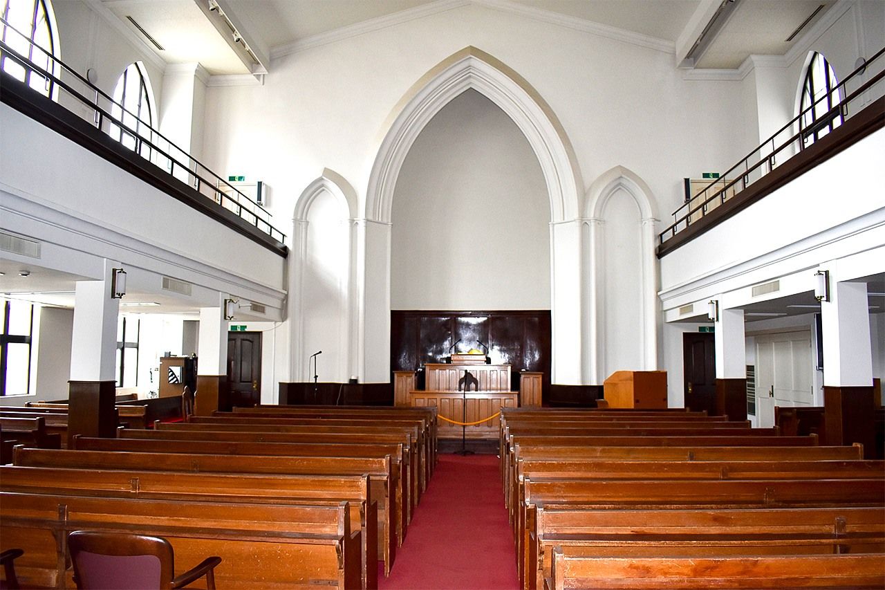 横浜指路教会の会堂は毎週土曜日に開放、見学もできる(2023年9月9日、横浜市中区尾上町)=評者撮影