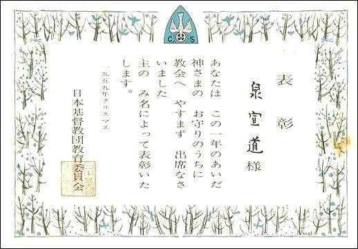 評者が小学生時代、横浜指路教会の教会学校(日曜学校)に通った”皆勤賞”に相当する表彰状(1959年クリスマス)
