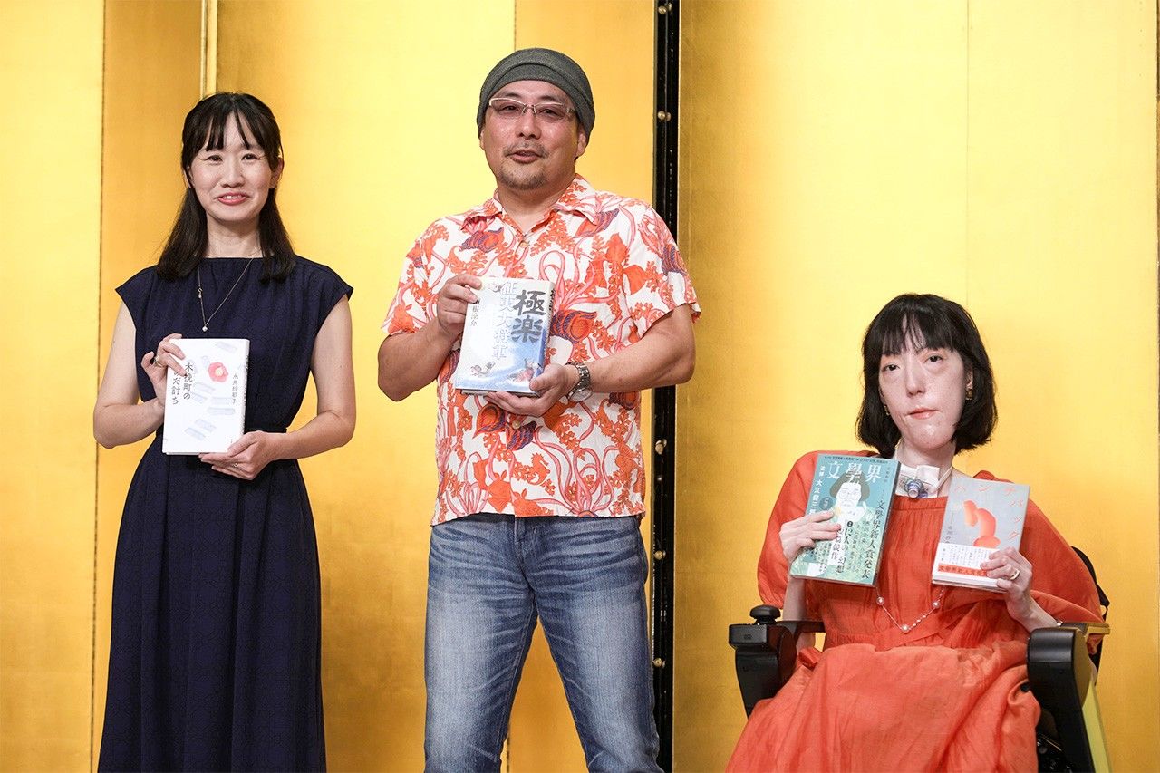 (右から)芥川賞の市川沙央さん、直木賞の垣根涼介さん、永井紗耶子さん=2023年7月19日午後、都内(時事)