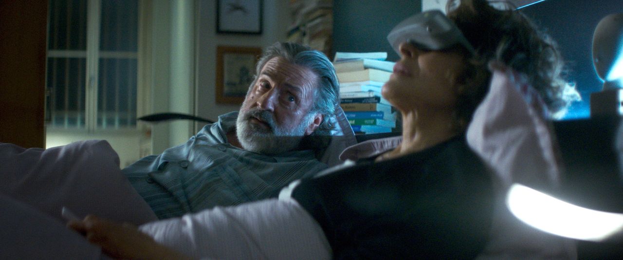 夫ヴィクトル(ダニエル・オートゥイユ)には目もくれず、VRゴーグルを装着し眠りにつこうとする妻マリアンヌ(ファニー・アルダン) ©2019 - LES FILMS DU KIOSQUE - PATHÉ FILMS - ORANGE STUDIO - FRANCE 2 CINÉMA - HUGAR PROD – FILS – UMEDIA