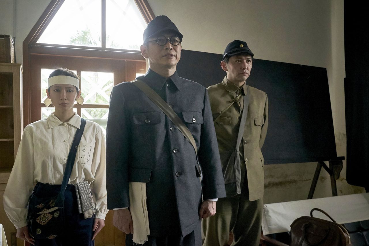島田県知事(萩原聖人、中央)と荒井警察部長(村上淳、右)、2人の下で働く県職員の比嘉凛(吉岡里帆) ©2022 映画「島守の塔」製作委員会