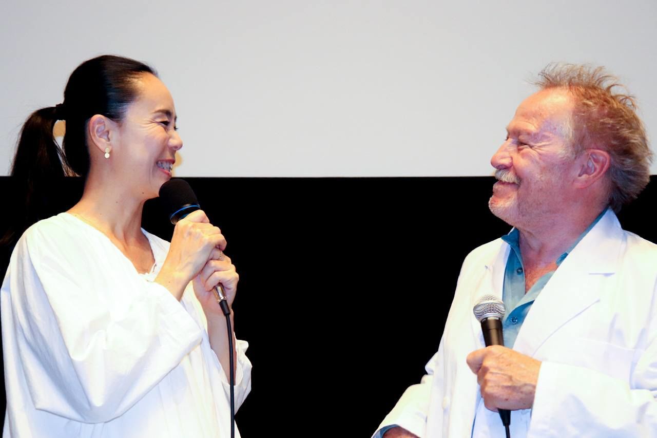 最新作『人生、ただいま修行中』の上映イベントに、観客サービスで「生まれて初めて」の白衣を着て現れた二コラ・フィリベール監督。奈良から駆け付けた河瀬直美監督と12年ぶりの再会を喜んだ=2019年10月10日、東京・市ヶ谷(撮影:渡邊玲子)