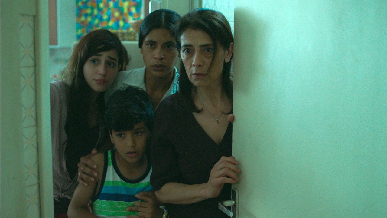 家の外で一体何が起きたのか? フランス映画を中心に輝かしい経歴を持つパレスチナ出身の名女優、ヒアム・アッバス(右)が戦地に赴いた夫に代わって一家を守る母を熱演 © Altitude100 – Liaison Cinématographique – Minds Meet – Né à Beyrouth Films