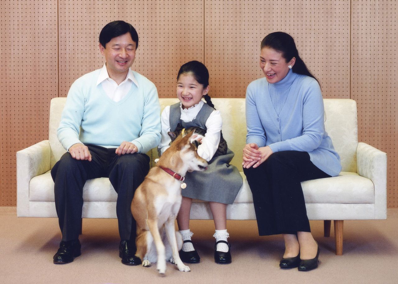 愛犬を囲んで微笑まれる両陛下と愛子さま=2010年12月2日、東宮御所(ロイター)