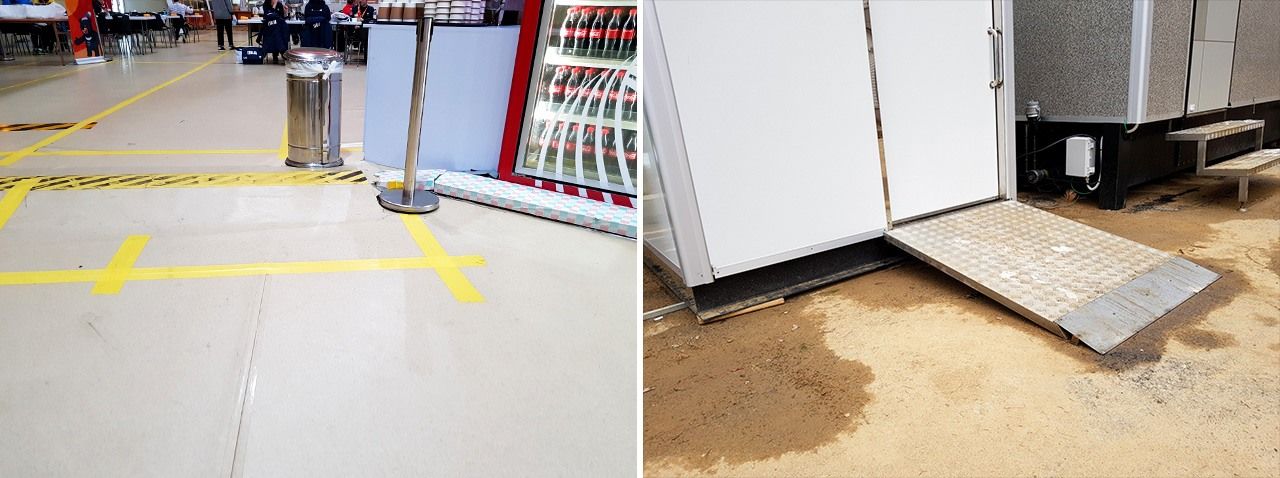 平昌オリパラの選手食堂。床に配線で盛り上がった箇所がある(左)。選手村の車いす用トイレ(右)にはスロープの上に平らなところがない