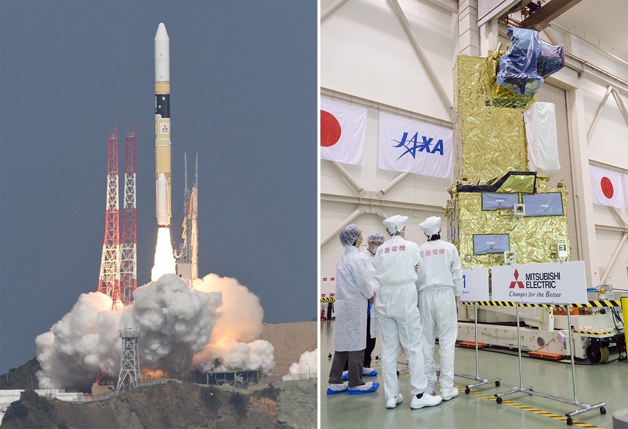 (左)温室効果ガス観測技術衛星「いぶき2号」などを搭載し、打ち上げられるH2Aロケット40号機=2018年10月29日(右)公開された温室効果ガス観測技術衛星「いぶき2号」(いずれも時事)