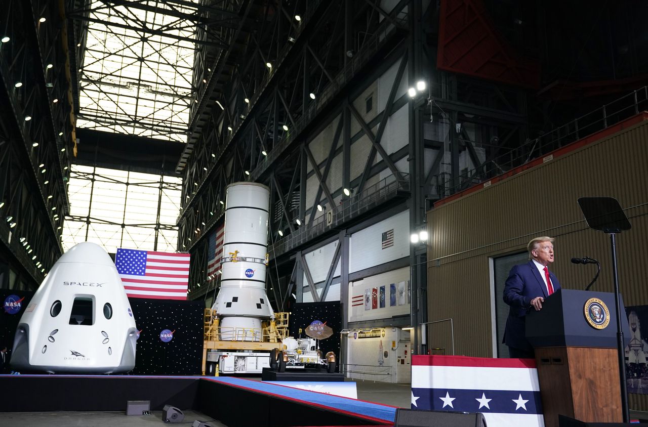 SpaceX社が開発した有人宇宙船「クルードラゴン」の打ち上げは、フロリダ州ケネディ宇宙センターで、米トランプ大統領も見守るなか成功した(AFP/アフロ)