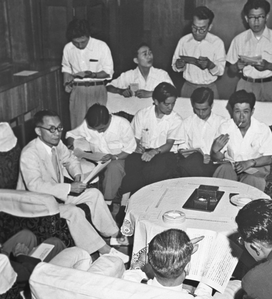 造船疑獄の最終結論を発表する佐藤藤佐検事総長(左中央)=1954年7月30日、最高検察庁(共同)