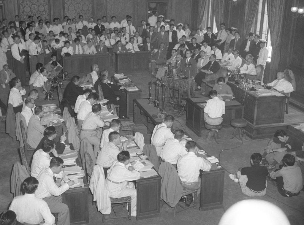 バナー写真:堤康次郎衆院議長(右手前、後ろ向き)に吉田内閣不信任案を手渡す岸信介・日本民主党幹事長、(左へ)浅沼稲次郎・右派社会党書記長、和田博雄・左派社会党書記長=1954年12月6日(共同)