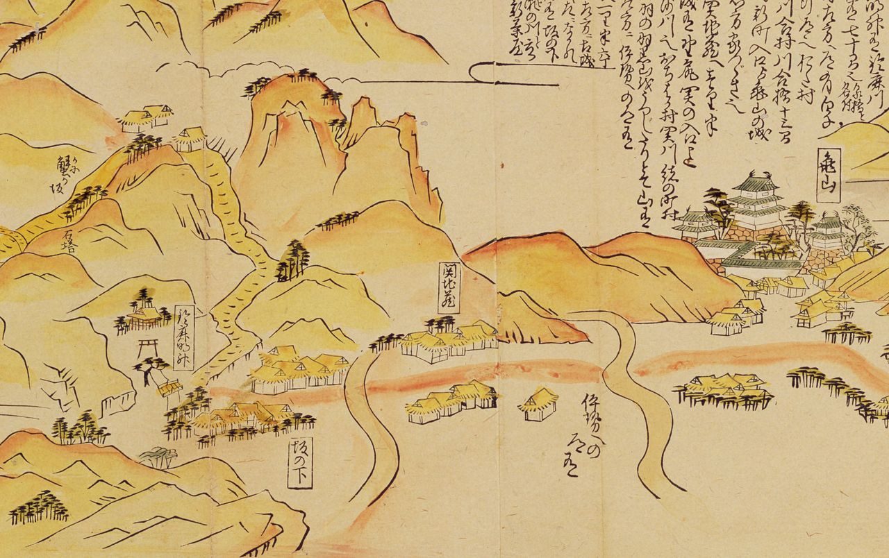 『東海道細見図』/ 街道や宿場町のディテールや、峠の標高差が分かるようになっている。この図は『伊勢参宮名所図会』にある関宿の辺りを描いたもの。右に亀山城、中央に関宿、右下に伊勢へと続く道が描かれている / 国立公文書館所蔵