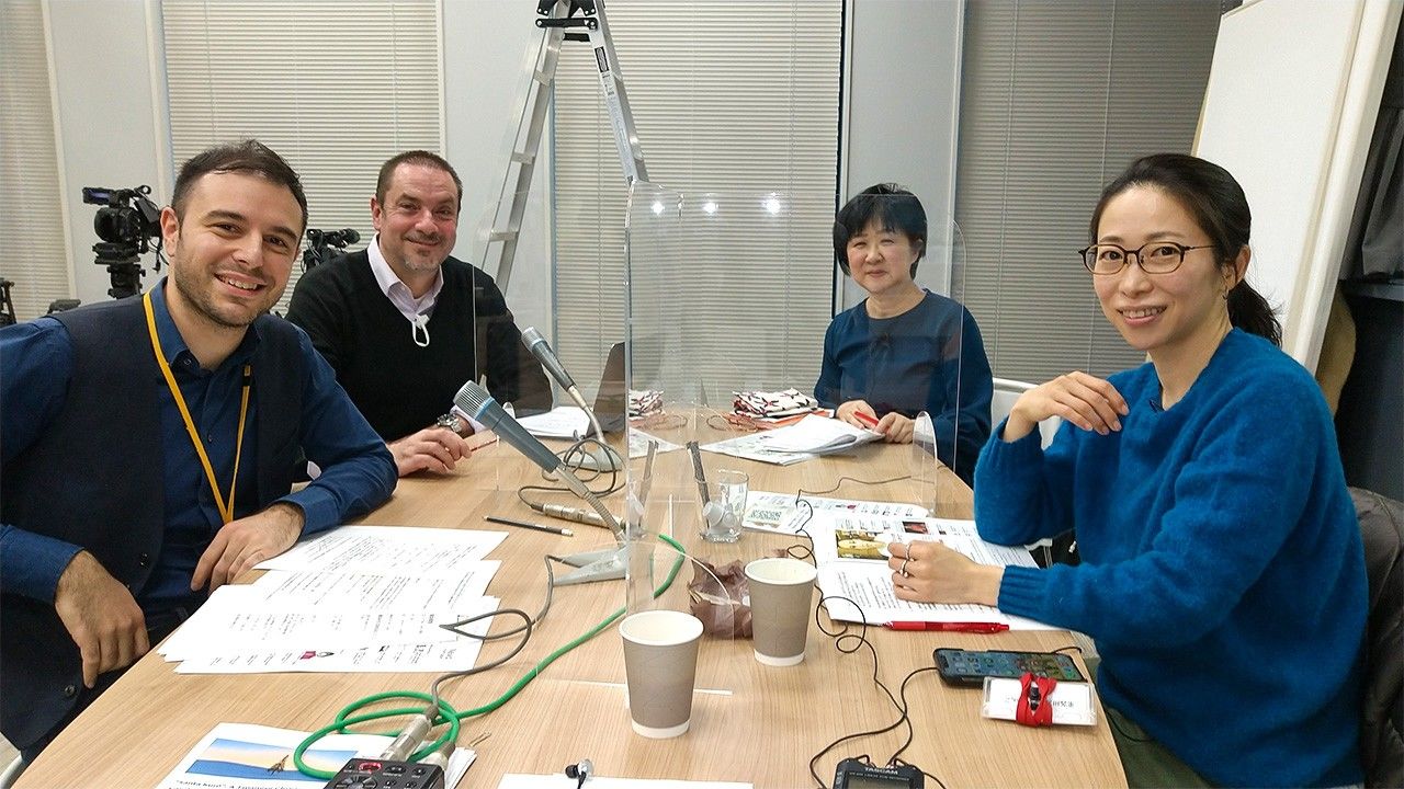 バナー写真:「大人のラヂオSP」2021年12月24日放送分収録の様子。前列左から、番組MCの一青妙さん、貝田尚重、後列左から八山、ダーフィー、ヴァンソン、ルビオ。 撮影:nippon.com編集部