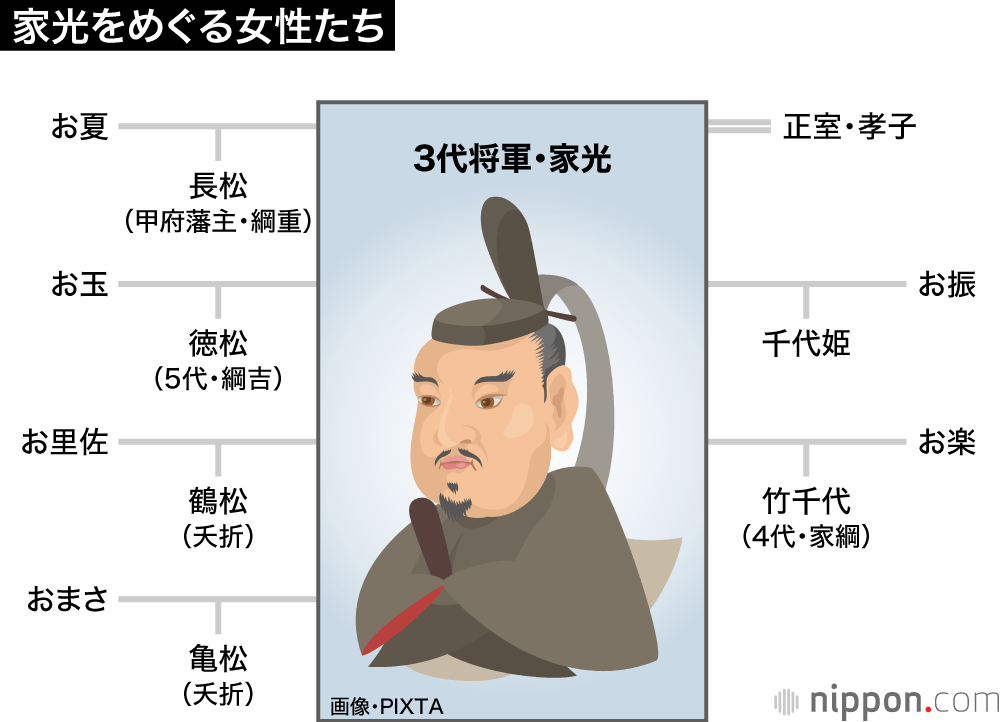 やがて側室が次々と男児を産む。2人は夭折(ようせつ)したが、竹千代(この名は徳川家の長子にしばしば使われる名で、家光も家綱も幼名は竹千代だった)は4代将軍・家綱、長松は甲府藩主・綱重、徳松は5代将軍・綱吉となる。