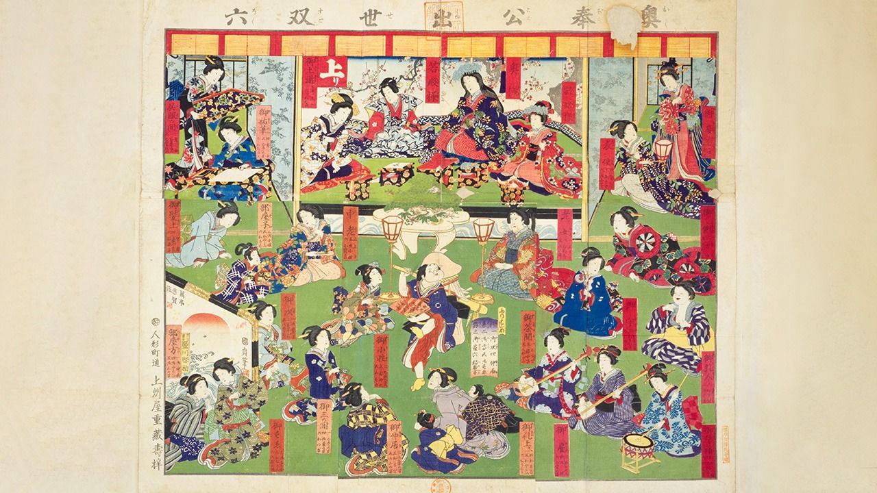 バナー写真 : 1858(慶応元)年作成の『奥奉公出世双六』。上中央の奥様(御台所)を中心に、さまざまな大奥女中の職制が描かれている。国立国会図書館所蔵