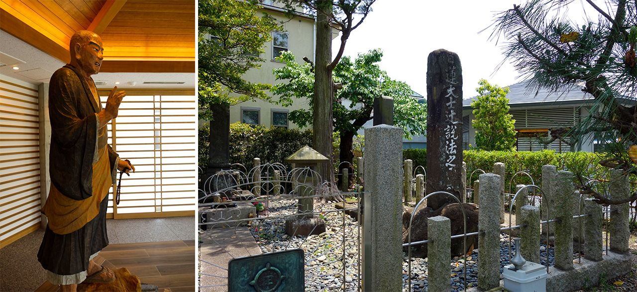 (左)鎌倉日蓮堂にある日蓮聖人像、(右)日蓮聖人の辻説法跡(筆者撮影)