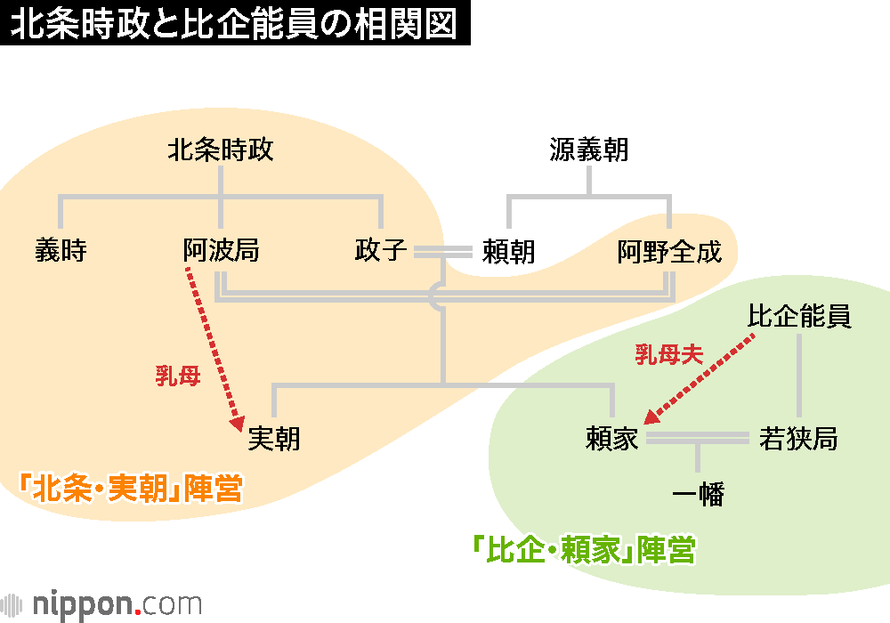 そして頼家自身も、乳母夫であり舅でもある能員の影響を受けて、北条家と敵対。「比企の変」に先立つ4カ月前、時政の娘婿・阿野全成(あのぜんじょう、頼朝の異母弟)を謀反の疑いで拘束した。「頼家が実朝・北条派の勢力を削っていこうという時に最初に血祭りに上げたのが全成であり、その殺害を命じた。さらに全成の妻・阿波局(時政の娘)の身柄引き渡しまで迫った」(山本氏)。時政と頼家はもはや「祖父と孫」の関係にはなかった。