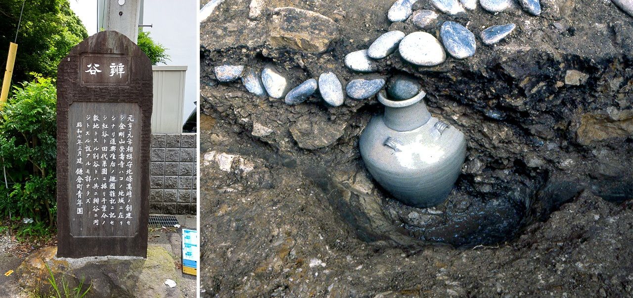 (左)弁谷の石碑(筆者撮影)、(右)新善光寺跡とされる「やぐら」から出土した白磁四耳壺。お経を書いた石が敷き詰められ高僧の墓とみられる(鎌倉市教育委員会所蔵)