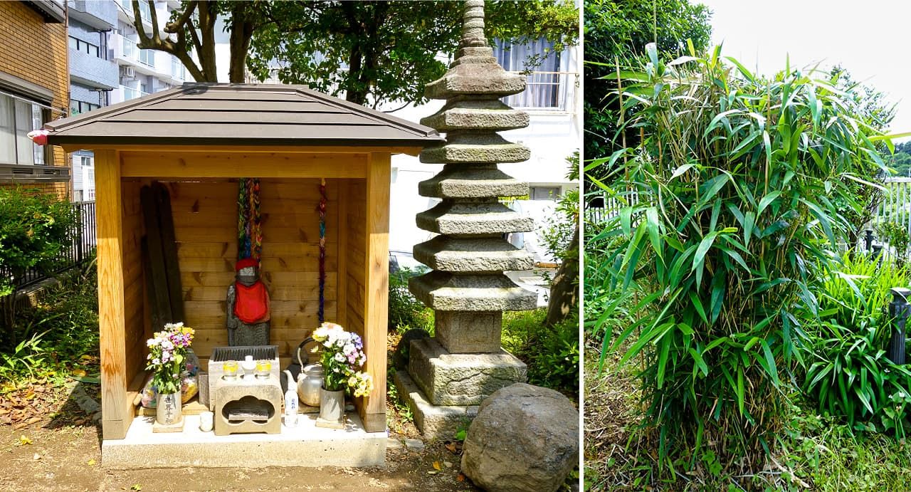 左側は重忠の首が祀られたと言われる首塚。右側はさかさ矢竹。討たれた重忠が「わが心が正しければ、この矢に枝葉を生じ繁茂させよ」と言って矢を突き立てたと言い伝えられている=いずれも横浜市旭区の鶴ヶ峰で筆者撮影