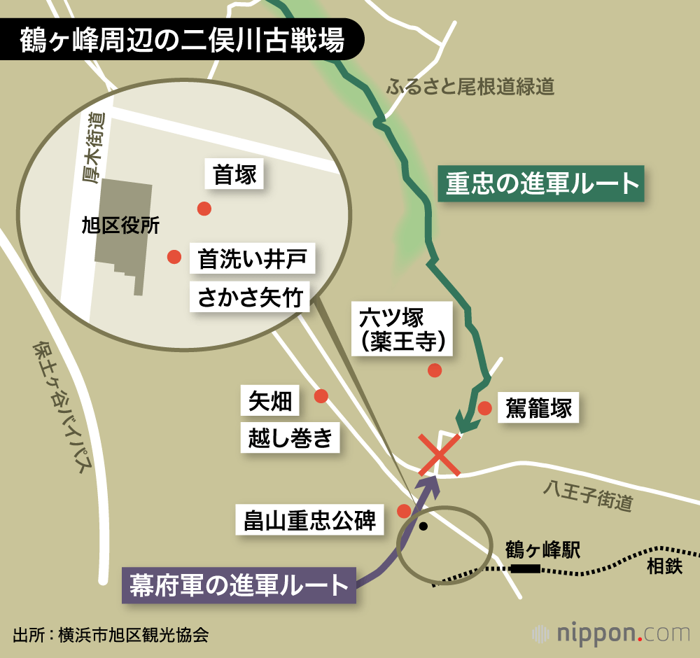 合戦の跡は、現在の相模鉄道本線・鶴ヶ峰駅周辺にいくつも残っている。駅の北西部辺りが主戦場とみられ、重忠公碑や首塚があるほか、幕府軍の放った矢が地面に突き刺さり矢の畑のように見えたことから「矢畑」と呼ばれる地がある。悲劇的なのは、合戦の報を受けて急きょ駆けつけた重忠の内室・菊の前だ。重忠の戦死を知って自害し、乗ってきた籠ごと埋葬されたという。「駕籠(かご)塚」と名付けられた。