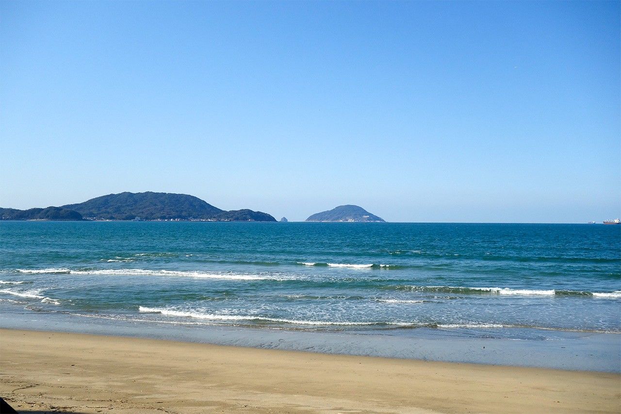 今津の海岸から博多湾を望む。中央に見えるのが玄界島(筆者撮影)