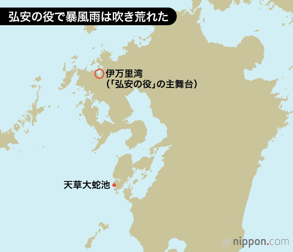 海底で元の軍船が発見された九州北西部の伊万里湾から、南に直線距離で約120キロに位置する池で、極めて強力な台風の存在が確認されたのだ。