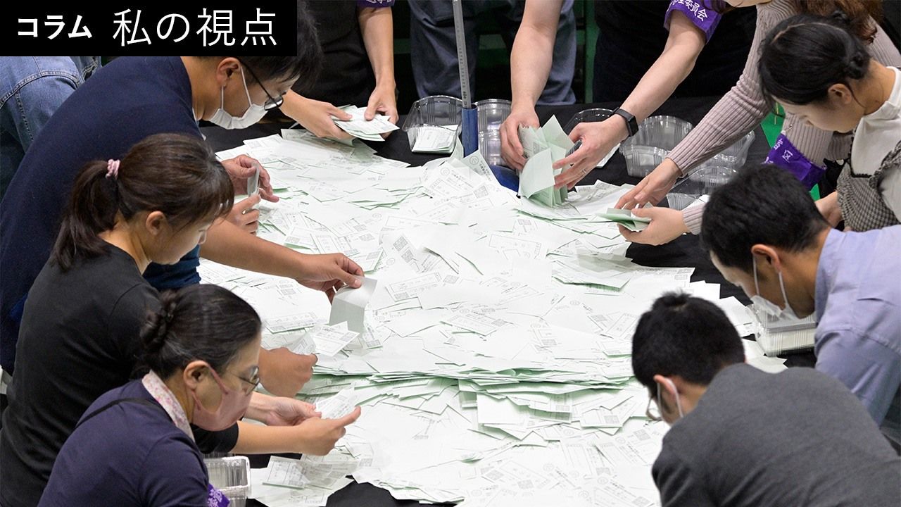 バナー写真:第50回衆院選の開票所で投票用紙を仕分けるスタッフ(東京都新宿区)=2024年10月27日(時事)
