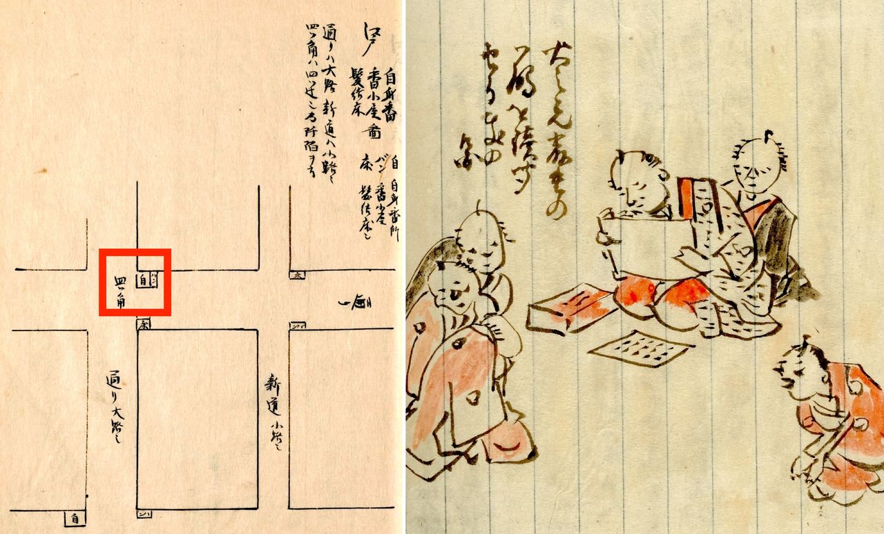 (左)『守貞漫稿 巻4』に描かれた自身番(赤枠)。家主の仕事場で四ツ辻(十字路)に立ち、町屋を管理していた。国立国会図書館所蔵 / (右)『藤岡屋日記』では、家主が火の元に注意せよという触書きを町人たちに読み聞かせている。東京都公文書館所蔵