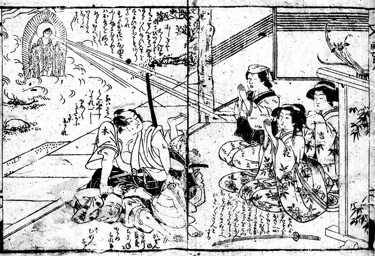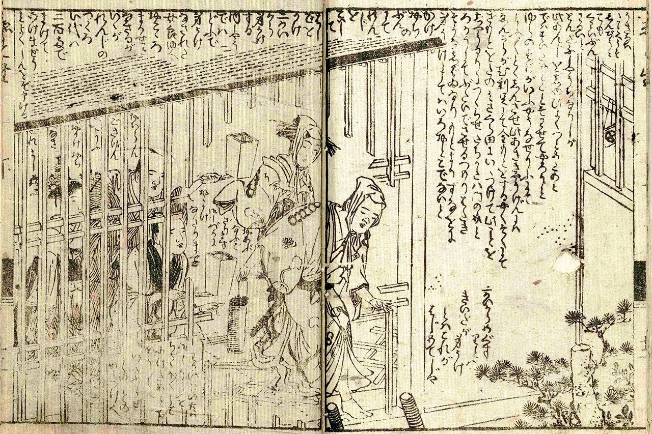 『江戸生艶気樺焼』では、艶二郎と吉原の女郎が狂言心中をはかるべく駆け落ちする。東京都立中央図書館特別文庫室所蔵