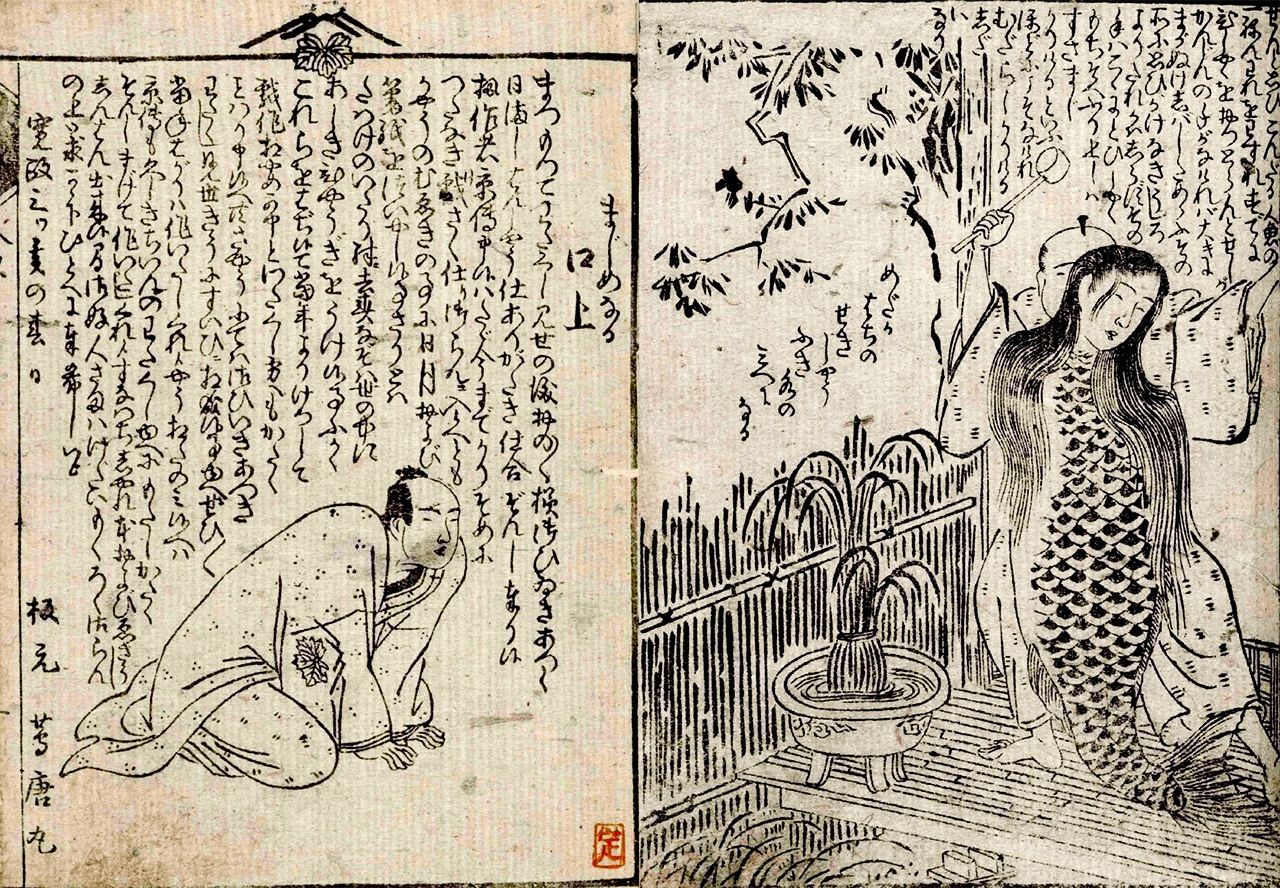 『箱入娘面屋人魚』は奇想天外な作品だった。亀を助けて竜宮城へ招待された浦島太郎。乙姫と仲睦まじく暮らしていたはずが、美人の鯉と浮気に走り、ついに妊娠させてしまう。生まれてきたのは人面魚体の怪しい生き物、つまり人魚だった。乙姫にばれたらエライことになると考えた浦島太郎は、人魚を捨ててしまう。