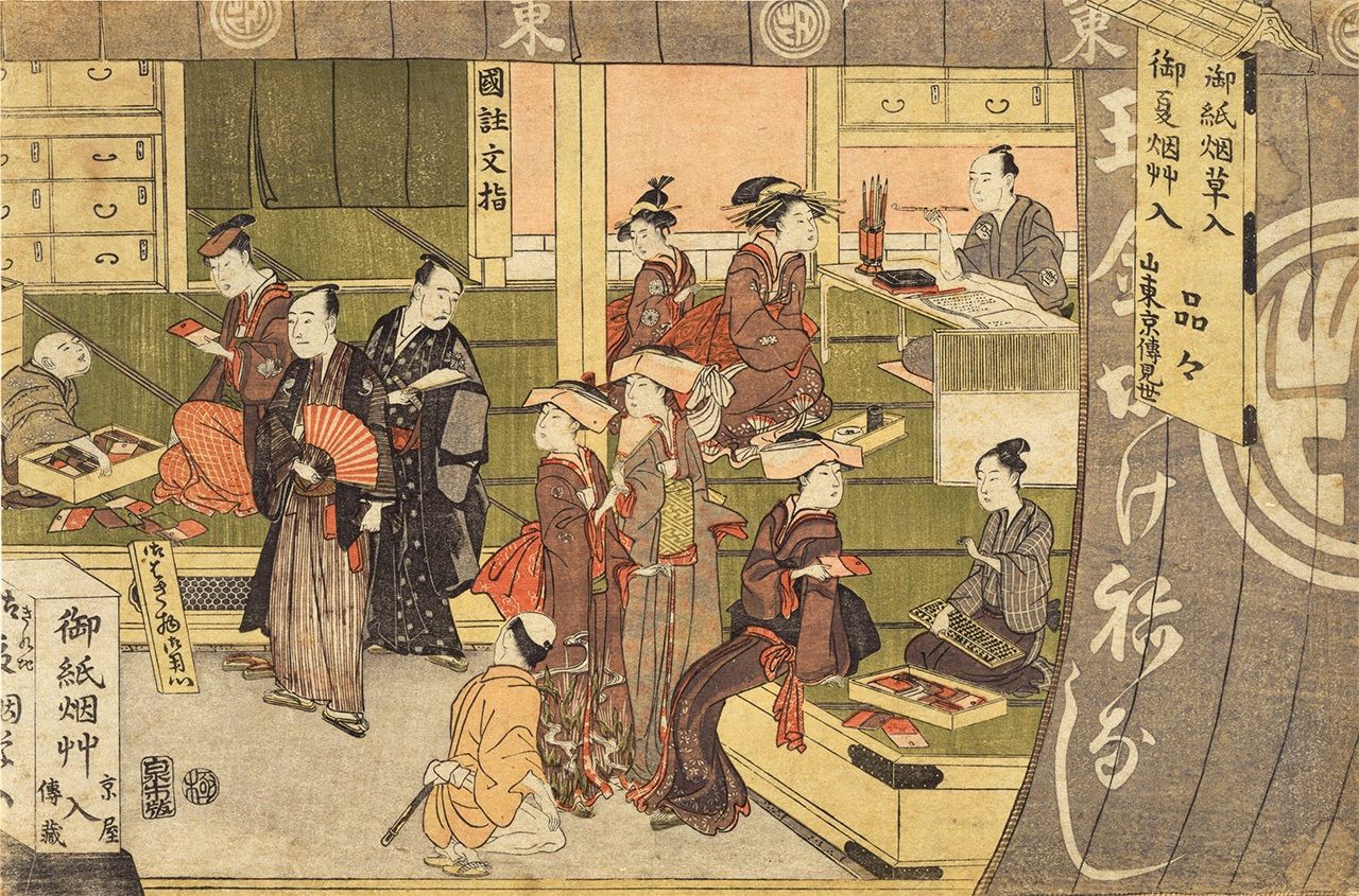 京伝が銀座に開業した煙草小道具の店。右奥に煙管を手に持った京伝がいる。出典:ColBase