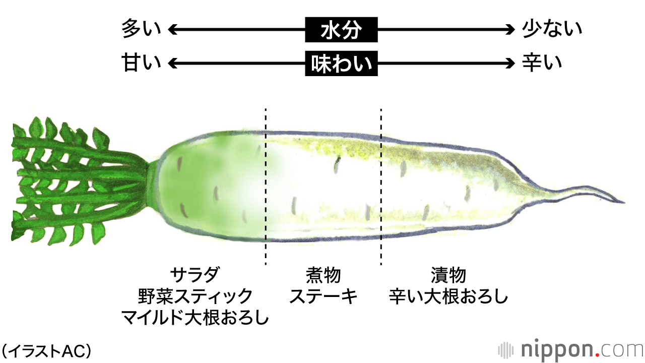 「冬ダイコンは甘みが増して」と書いたが、夏は害虫から身を守るために辛味が強めなのだという。また、部位によっても味わいが異なる。水分量が多く、甘みの強い上の方はサラダや野菜スティックなど生食向き。バランスの取れた中央部分は、煮物やステーキなどメインのおかずに。下の方は漬物やみそ汁の具材など細かく切って使うのが理にかなう。
