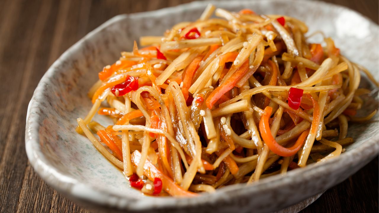 家庭の食卓、居酒屋、定食屋…あらゆる場面で登場する定番の総菜。せん切りにしたゴボウとニンジンを唐辛子と炒め、しょうゆと砂糖などで甘辛く味付けするのが定番。一風変わった料理名は、江戸時代に流行した浄瑠璃の主人公・坂田金時(金太郎)の息子である坂田金平にちなんだもの。ゴボウのしっかりした食感と歯応え、唐辛子のピリッとした辛さを、金平の強さや勇ましさにたとえたとされる。