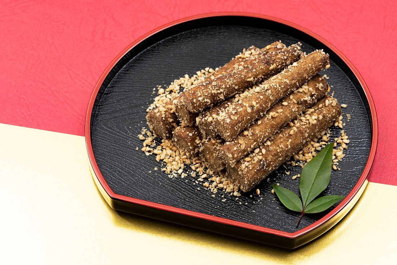 甘く煮たゴボウと白みそあんを軟らかい求肥で包む。元々は年初めの茶事「初釜」で供されたが、今では正月の定番和菓子に。