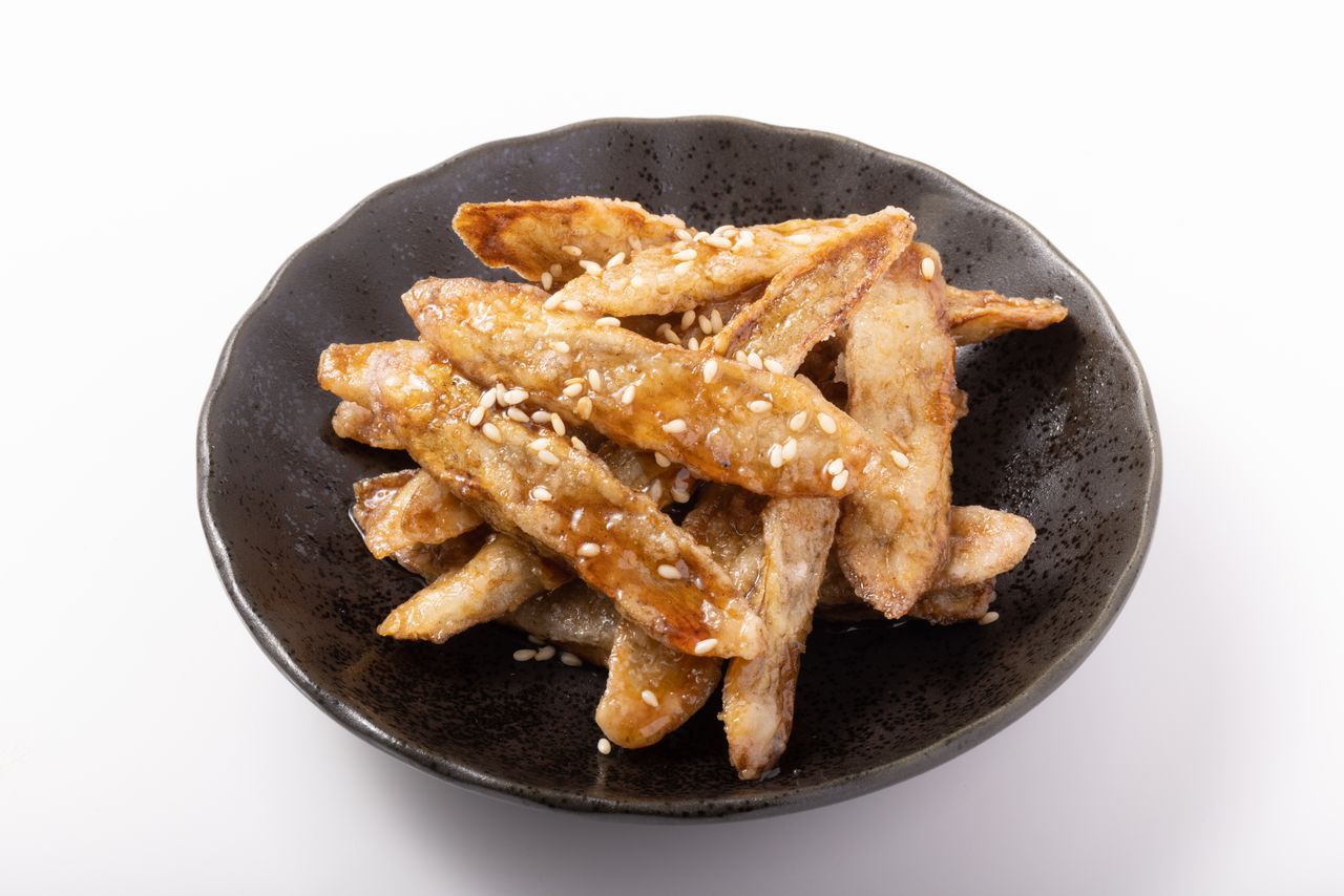 斜め薄切りやささがきにしたゴボウを揚げ、しょうゆや砂糖で作った甘辛いたれを絡めたもの。スーパーでも見かける人気の総菜。