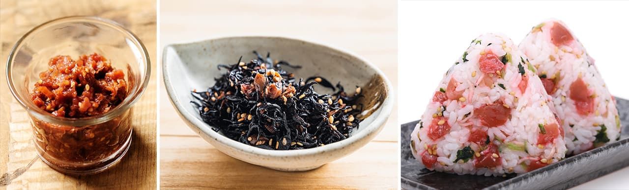 左から梅おかか、梅ひじき(いずれもPIXTA)、梅しらすのおにぎり(フォトAC)