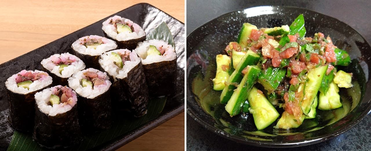 キュウリも自己主張が強くない食材の一つ。しばしば梅とタッグを組み、巻きずしになったり、あえ物になったり。