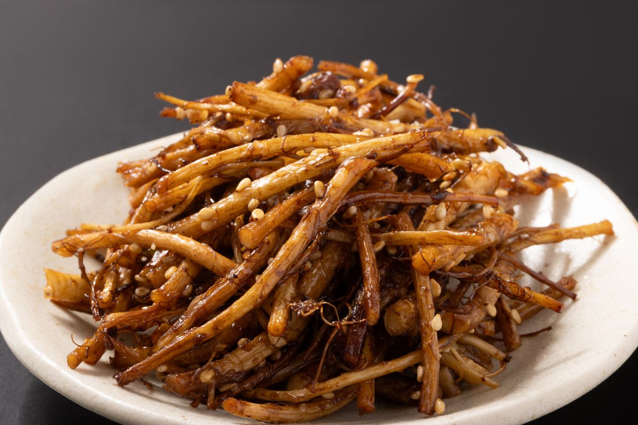 泥を丁寧に洗って落とし、きんぴら風に。こりこりとした食感が楽しい。食物繊維たっぷりのデトックスメニュー。