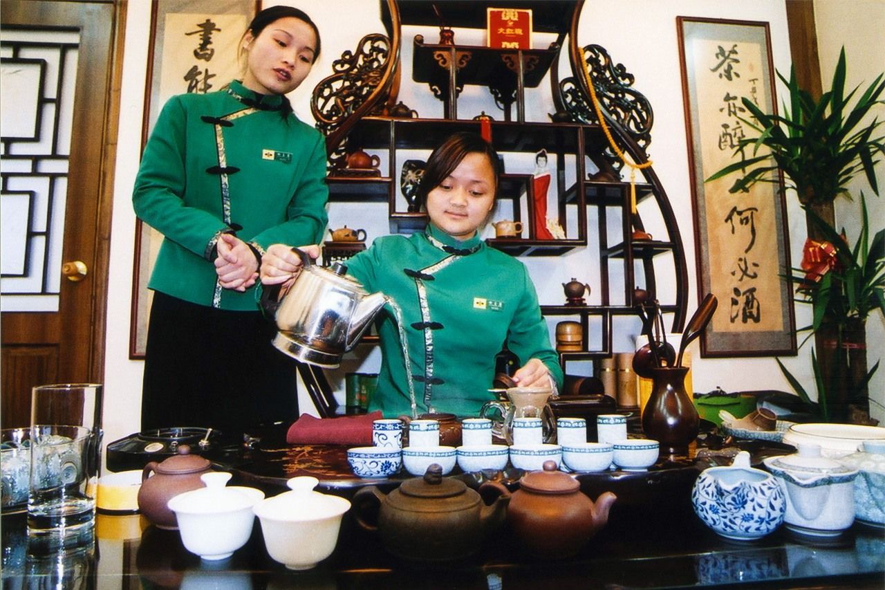 一方、台湾では1970年代から「台湾茶芸」という新しい茶の作法が編み出された。急須(茶壺)で淹れたウーロン茶を小ぶりの円筒形の器に入れ、まず香りを楽しみ、それを別の小さな茶碗に移して口に含む……。こうしたサービスを提供する茶芸館が台湾で80年前後から急増したのだ。その背景には経済発展で人々の暮らしにゆとりが生まれたことや、民主化の進展があったといわれている。