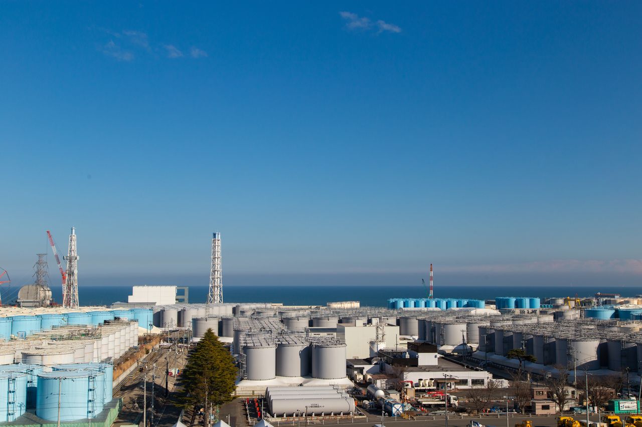 現在の福島第1原発の風景。手前のタンクは汚染水を浄化処理した水を保管している。画面奥には穏やかな海が広がる