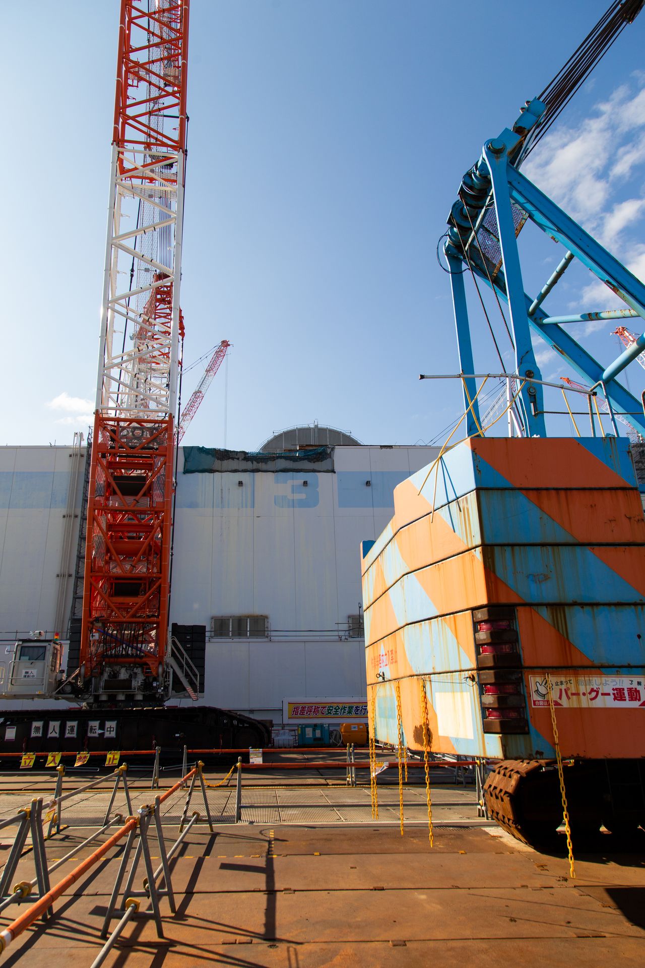 バナー写真 : 廃炉作業が進む3号機周辺。一見すると普通の工事現場のようだが、原子炉格納容器には、いまだに熱を発し続ける燃料デブリが残っている