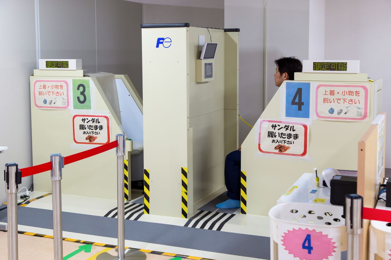 体の中にある放射性物質の数をカウントするホール・ボディ・カウンター。1分間で計測して、すぐに結果が出る