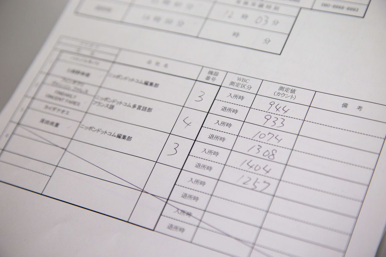 ホール・ボディ・カウンターでの検査結果。筆者(表の3番目)は取材前の計測では1404だったが、取材後は1257に減少していた。元から3人の中で最も数値が高いのは日ごろから海藻好きなことが影響しているらしい