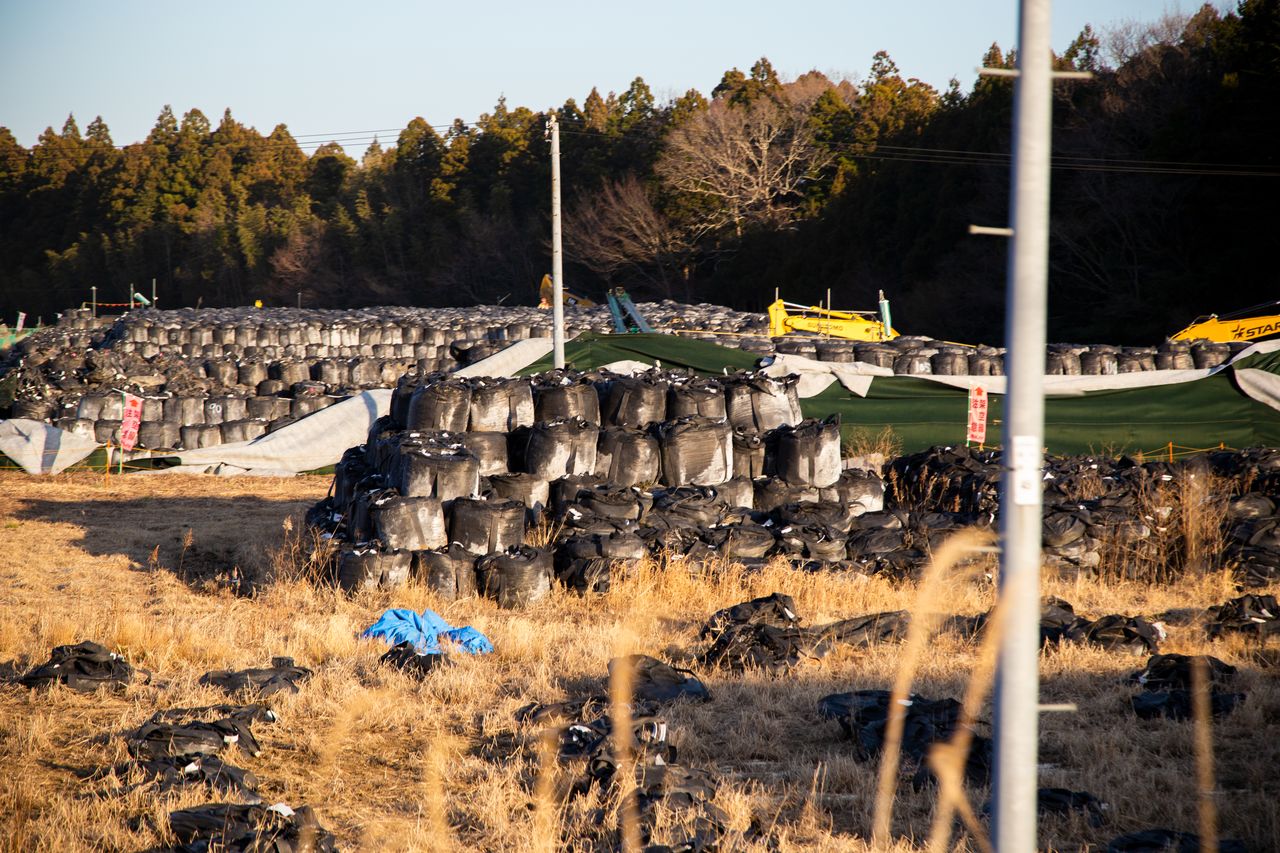 「しまむら」の道路を挟んで向かい側には、除染廃棄物とみられる大量のフレコンバッグが積み上げられていた