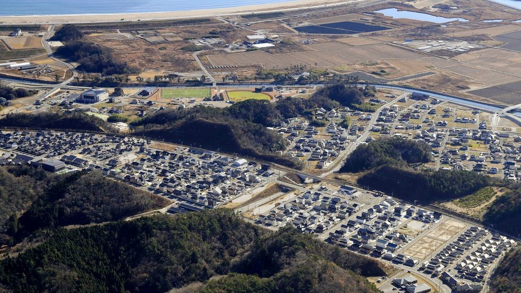 バナー写真:被災自治体の負担ゼロで高台に整備された住宅地(手前)=2020年12月、宮城県東松島市(共同)